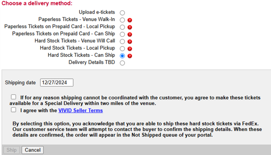 If you had originally anticipated an order requiring Special Delivery but receive hard stock tickets prior to the event with time to ship, you may request the option to ship by doing the following: