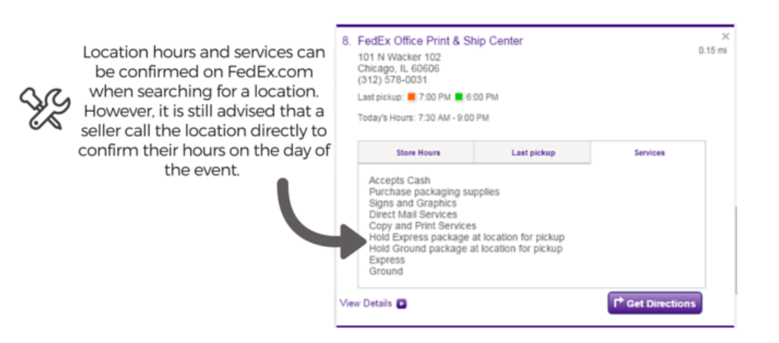 - Select "FedEx Drop Off Location" if the tickets are held for pickup at a FedEx location within 2 miles of the venue.