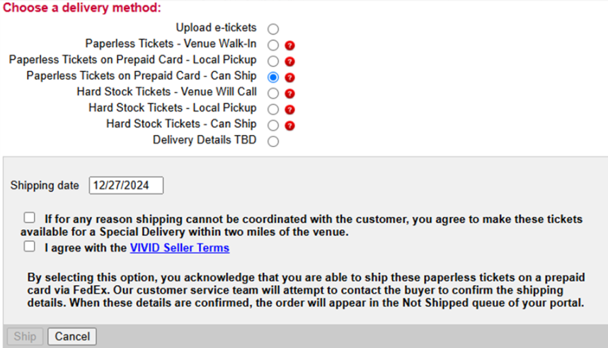 - Click "Ship." This will alert the customer and the Vivid Seats Customer Service department that an airbill is required. The order will now appear under "Pending Vivid Action" until the customer's shipping address has been confirmed.