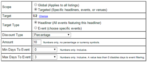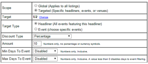 Enter the amount or percentage that you wish to discount your tickets. In the example below, all U2 tickets will be discounted by 10%. If a specific U2 event was chosen, all tickets for that event will be discounted by 10%:
