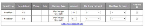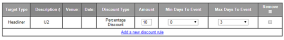In this example, all U2 tickets will be discounted by 10% starting 3 days before the event, up until the day of the event: