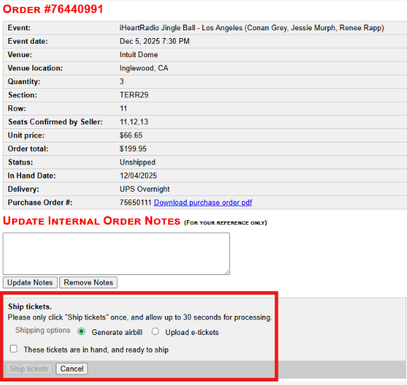 Airbills must only be generated if tickets are in-hand and ready to ship. Generating airbills prematurely may result in order cancellation. Please review the policies in section 5.3 of the Large Seller Handbook.